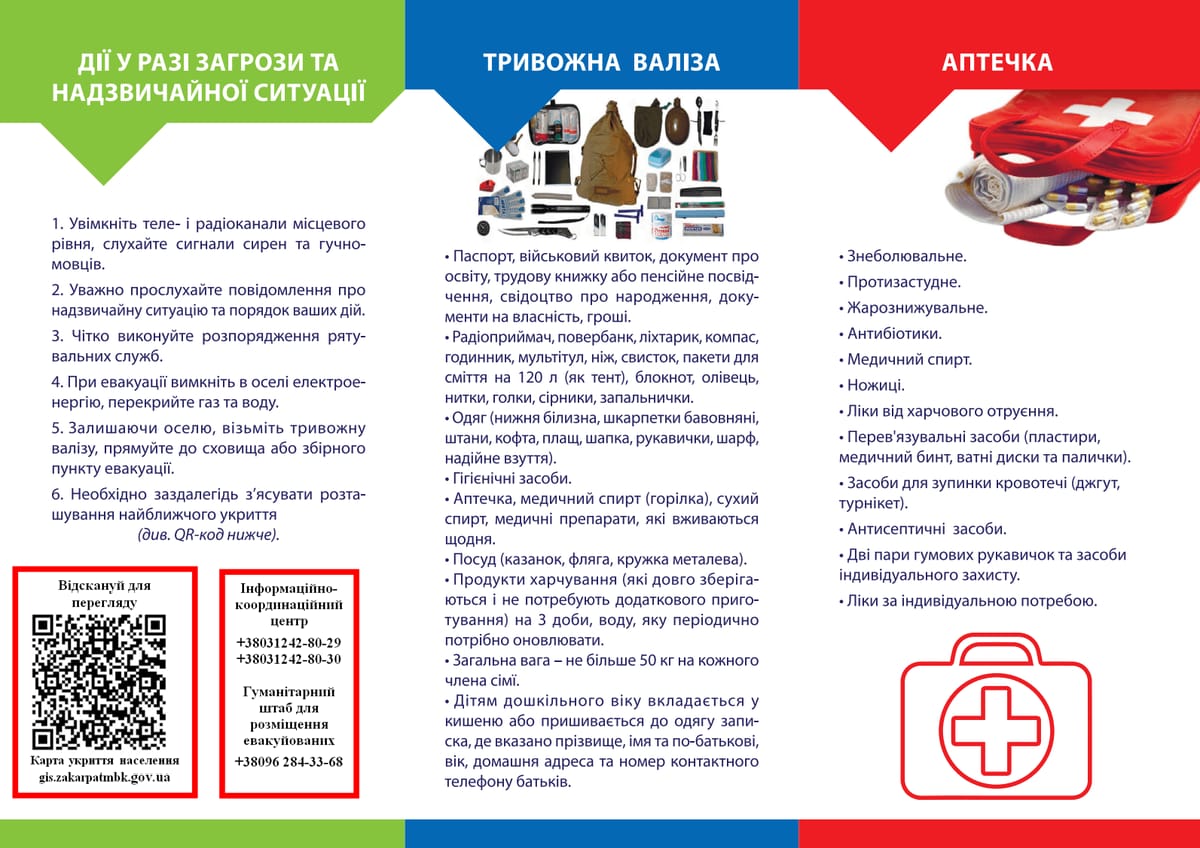 Дії у разі загрози та надзвичайної ситуації; Тривожна валіза; Аптечка