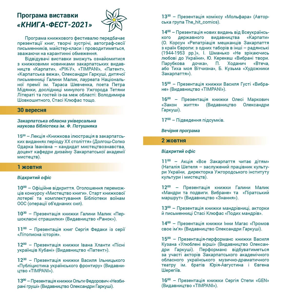 У програмі – презентації книжкових новинок закарпатських авторів та видавців, творчі зустрічі з письменниками, автографсесії, майстер-класи для містян та гостей обласного центру.